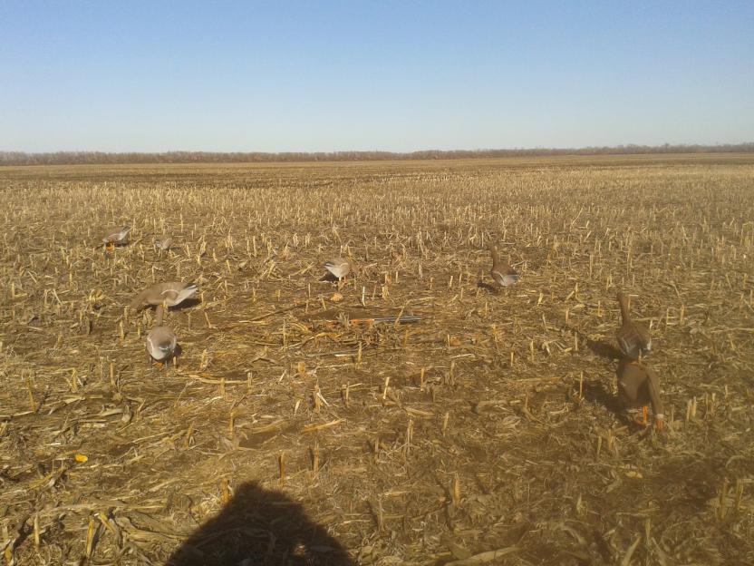 Ну что ж, напишу и я небольшой отчётик по открытию. Ездить искать гусика начали ещё за неделю, нашли, много… Приехали в пятницу, разбили лагерь, для тех кто хотел поохотить утку - нашли озерцо, которое уже вскрылось и небольшие разливы, бросили чучела определили места где спрятаться можно. А сами смотрим где над полями идет основной пролет. Определили где коридор и в ночь уехали копать. Нашли в темноте котел, ор гусинный стоит аж в ушах закладывает. Не доезжая до предполагаемого котла где то 700 – 800 м, приняли окапываться на перепаханном поле, как раз на трассе гуся. Ну кто копал тот поймет, какая это нелегкая задача, по ночи месить чернозем. Нас было трое, выкопали 3 окопа, как смогли замаскировали землю. Выставили чучела. Все подготовили, поехали в лагерь. Поспали 1,5 часа и в путь. Так получилось что доехал до места я один, мой напарник уехал дальше в посадку, причины не важны, важно следствие… Гуся было море, тыщи и тыщи, направление мы угадали и место тоже, шли и высоко и низко, ноооооо не долетая 200 – 300 м уходили в высь…. Посмотрев со стороны стало понятно что пугает… маскировка, с большой буквы М была никакая, кучи черной земли, все вокруг вытоптано, не закрытые 2 свободных окопа, короче говоря утрянка была потеряна…. Вернувшись в лагерь, немного смазав разочарование, обсудив недочеты, приняли решение потратить больше времени и качественно подойти к маскировке. Поехав на место ночной «стройки», и хорошенько осмотревшись, в километре нашли поле скошенной кукурузы и подсолнуха. Начали копать, взяли мешки и вывозили землю, долго, скрупулезно, но мы это сделали. Подготовили из сетки накидки, замаскировали их скошенными стеблями кукурузы. Расставили чучела по специальной методе, которую где-то вычитали. Вернулись в лагерь где-то часа в 4 дня, быстро поели, перебрали патроны и в бой, на подъезде к нашим окопам из далека уже было видно что ОН там, стайки кружились, кто то присаживался…. Ляпотаааа. Сели и начали манить, но гуся на вечерке было очень мало по сравнению с тем что творилось утром. Но он был, первые же налеты показали что с маскировкой все гуд, гусь подвоха не чувствует и налетает отлично. За вечерку взяли одного и было много досадных промахов, в след раз нужно ставить в стволы цилиндры и брать патроны без контейнера, на коротке самое то будет, ну и конечно практика и тренировка стрельбы.