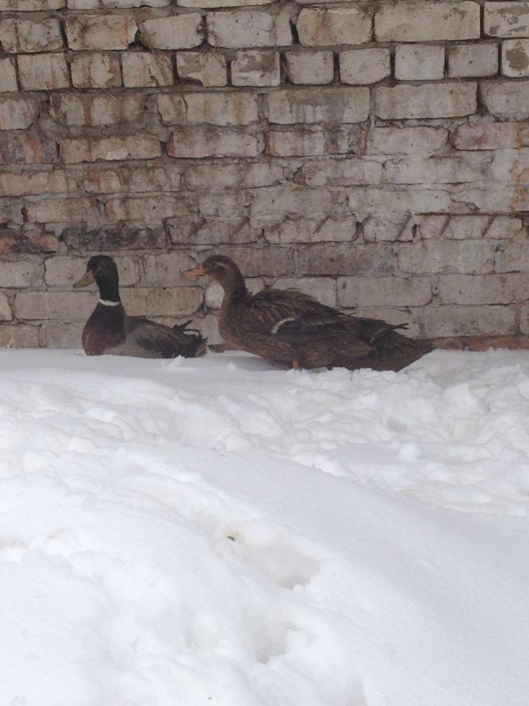 Съездил сегодня проведал своих. Подрезал крылья. Ногавки надел. Выпустил на снег. Купаются, жрут как бульдозера. В сарайчик возвращаться не хотят.
