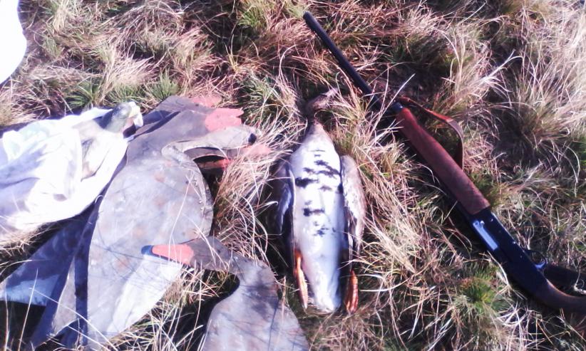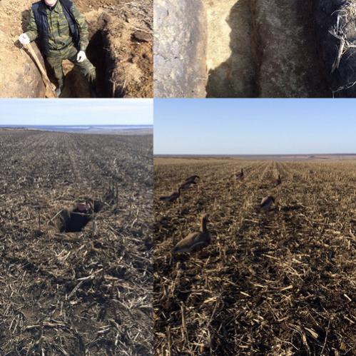 Окоп копали усердно с 21-00 до 2-00, задолбались если честно, грязные, вонючие, земля липнет к лопатам, а тут сюрприз - камни... Вобщем кое как... Скрадок получился неплохо, но ночью, а днем оказалось плохо (сдерживаю мат)... На фотке уже доработанный... В 4-00 расставили чучела все налеты...Сзади сидят с электронным манком парни - на них гусь валит, а я в БГ-1 свищу, они на меня сворачивают... Ну думаю... домой завтра поедем, жаль прицеп не взяли...))) А Гусь за 100-150 метров как ошпаренный от нас шугается, весь... 26 налетов и только один на расстоянии 70 метров, осталные - как стену кто поставил... Одного ранил - за 800 метров ушел и упал, коллеги добрали и не отдали, да я и не настаивал...((( (Лыко блин, сухой землей не испачкать... Мож пригодится кому)))... Пришлось по селезням отыграться... Практически всех видов взяли, классически на чучела и манок... Широконоса упустили... остальные комплект (на фото не все)! Всех отличившихся "С полем", остальным "Ни пуха..." Яркая и запоминающаяся охота!!! |
