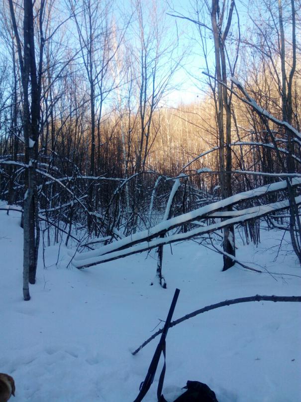 С вечера решил поеду .Прибыли в угодья раненько выжловку напустил .Гляжу заинтересовано челночит озимые,подошёл следок жировочный и належку.Метров через 300 собака помкнула и погнала.Но заяц в лес потом на трассу вобщем 1-0.Решил переехать возращаюсь к машине собака второго поднимает.2 часа гона и 2-0 в пользу зайца.Вымотались мы с выжловочкой решили домой (тоже не добрым словом себя .... за лыжи).Не доходя до машины сдвойка и прыжок .Ну думаю не уйдеш .Иду за собакой он её пропускает и прыжок в лево отпускаю на 20 метров чтобы собачку не задеть и 2 делает своё дело 2-1 размочили.
