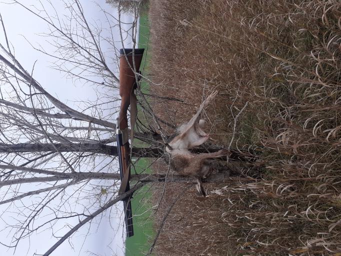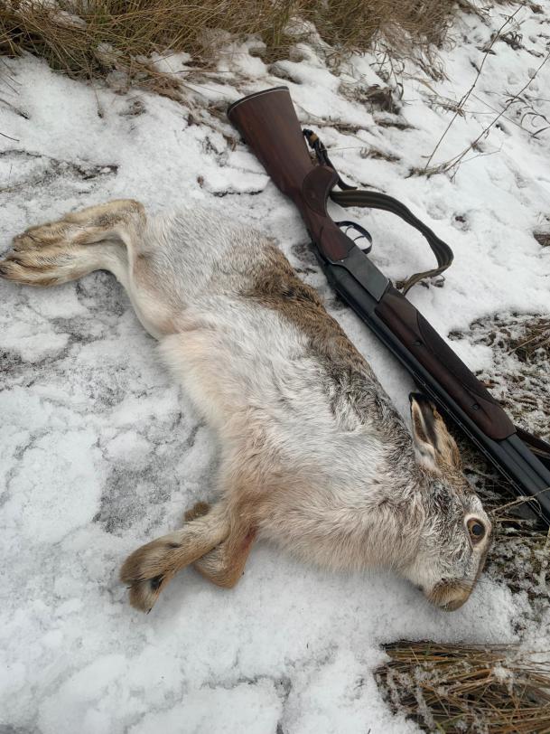Итак, 04 ноября. В о/у приехал в 8.00. Поразило количество выпавшего снега. Ура! Его слой позволял тропить! Ждать свояка, еще 30 минут, не стал и взяв первый след пошел тропить. Заяц с "зеленей" пошел в не скошенный подсолнух. Делал стройки и сдвойки, скидывался незаметно. Выходной след находил и шел по-нему, уже чувствуя, что заяц идет на лежку. А тут и свояк подъехал, и сходу был проверен производственным инспектором(ему посчастливилось в этот день еще раз быть проверенным уже другим инспектором). Свояку сказал по рации, чтобы шел по дороге вдоль поля подсолнечника, а сам в надежде, что получится выдавить зайца на дорогу, пошел дальше по следу. И сначала, как бы и получалось, что заяц стал спрыгивать в сторону дороги, но потом спрыжки и дальнейший след стали уходить в глубь поля. В результате тропления в подсолнечнике,заяц был поднят(лежку нашел), но пошел он не к дороге, а поскакал напрямую, без петляний, в голубь огромного поля подсолнечника, а я, тоже напрямую, пошел к дороге. Следов зайца на дороге было много. Пытались найти тот единственный, который бы вел на лежку. Но все заканчивалось подсолнечником. Вернулись к машинам и пошли через поле "зеленки", вдоль которого и с которого пришел заяц, которого я тропил. На другой стороне поля следов почти не было. Это радовало. Значит заяц мог лечь, где-то здесь, с края поля в траве. И вот она, заветная концевая сдвойка. Впереди небольшая группа густо растущей молодой поросли в небольшой низине в окружении травы и небольших холмиков. Свояк пошел, обходя деревья справа, а я пошел напрямую прямо к деревьям. Когда до них оставалось метров 20 я увидел подъем зайца. Прямо перед собой. Крикнул, "Пошел". Стрелять было бесполезно из-за густой поросли, но я выстрелил в надежде, что заяц пойдет вправо на свояке. Но этот засранец после моего выстрела резко повернул на 180 градусов и рванул за деревьми влево в сторону поля. Где я мог наблюдать его королевский бег. К этому времени снег уже таял. Больше в этот день мы зайцев не видели. 05 ноября тропить уже не получилось. Снег почти весь растаял. Пошли по чернотропу. Выбрали удобное место: идем вдоль одно посадки , возвращаемся по другой, между ними овраг. Первая посадка оказалась пустой. Спустились в овраг и поднялись к посадке, что бы идти в обратную сторону. Свояк шел вдоль боронованного поля, а я со стороны оврага. Шел челноком: от посадки к оврагу по траве и обратно. Дошли до места, где между оврагом и посадкой на склоне к оврагу, тесно росло несколько деревьев диких фиников. Начал топтать траву между деревьями и тут услышал справа чуть спереди шум подъема зайца. Крикнул: "Пошел". Самого зайца и куда он побежал, я сначала не увидел. Рванул на открытое место между деревьями, и тут же увидел, несущегося справа налево, спереди от меня, зайца. Расстояние было метров 35-40. Вскинул ружье, поводка, вынос и выстрел. Какая-то временная пауза, и тут зайца, как подбросит в верх с переворотом… Упал и замер. Вскрытие показало, что дробь "3" БК, СКМ, правый ствол "получок", при разлете дроби на таком расстоянии, плотно накрыла всего зайца: от шеи до задних лап. Дробь и в печень попала, но несколько дробин остались и под шкурой, не пробив кожу. Вес зайца 3795гр. Всего лишь первый заяц сезона 2022-2023г. До этого зайца, после 22 октября, два раза мазал по 100 процентным зайцам. А все, из-за попытки перейти на новый для меня 