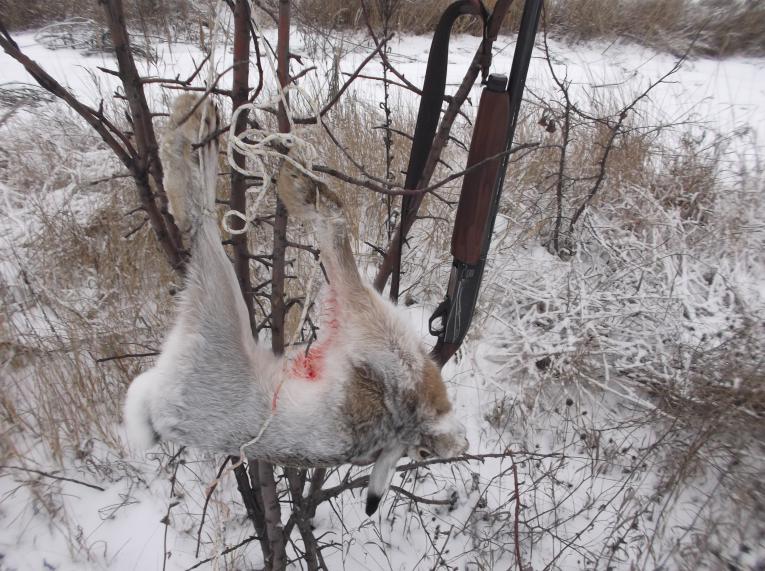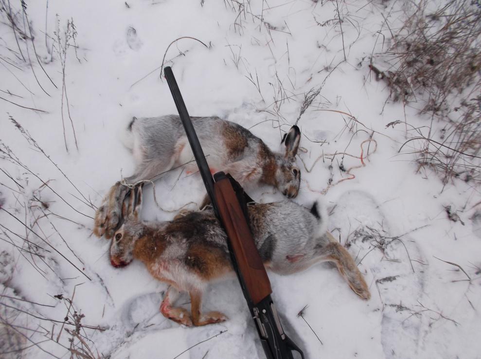 Вчера промазал по зайцу вскочившему передо мной в 5 метрах. Убегал он как спецназовец, прыгая та в право то влево. 4 патрона - а дальше овраг спасительный. Прошёлся через час по следу с километр ,крови нет ,скачет ровно ,значит чистые промахи. Забрался в густой ивняк и был таков. А вот сегодня зайцам не повезло. Первого вытропил в небольшом лесочке около капустного поля. Наделав несколько сдвоек то в лес то в поле косой пристроился с края лесочка. Но встал незаметно ,я его увидел уже убегающим метрах в 35-40. Два выстрела в догонку и зай скрылся за деревьями. Я пошёл проверять гонный след и немного пройдя вижу что заяц начал кашлить кровью. Побежал было догонять ,но вижу моего зайца сидящим на полевой дороге . Я тоже присел метрах в ста от бедолаги и стал наблюдать что будет дальше. И минут через 5, зайчик завалился на бок и затрусил ножонками. Я подбежал и добрал его руками. Иду в сторону машины довольный и бац ,ещё сдвойки. Снимаю добычу с плеча, ложу в снег и пошёл по сдвойкам. Через пару минут подъём в 3 метрах спереди. Отпускаю и начинаю опять мазать. Только четвёртым накрыл зайца наглухо. Снайпер из меня никакой. Что заметил на коротких дистанциях 15-25 метров часто мажу ,а на 40-50 попадаю. И зайцы в этом сезоне какие то усидчевые. Подпускают почти в упор, если проходишь мимо в 7-10 метрах даже не реагируют, хотя наст хрустит хорошо.