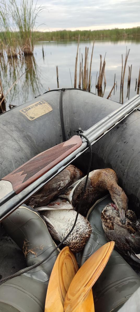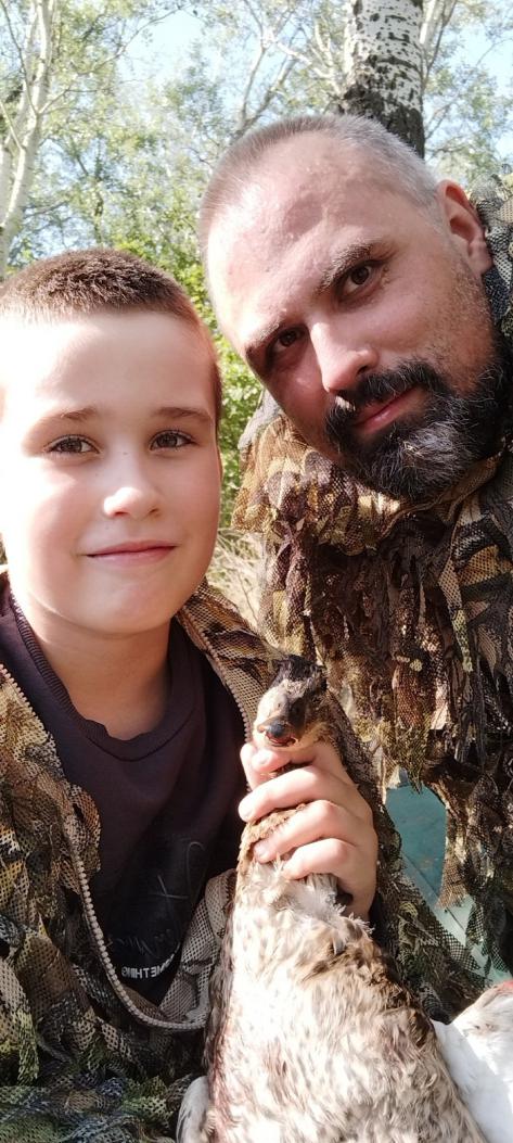 Отдыхая от непривычного кряканья уже решил что вот теперь все – апогей прошел можно и домой, стал было разряжать ружье, как со стороны скрывшихся уток раздалось еле различимое Кря.. Беру манок и в слабой надежде даю ответ и мне ответили далее в течение получаса пытался максимально изобразить все что слышал в речитативе утки включая подобие посадки услышанной в ютубе – в итоге мой собеседник затих, затих и сын наблюдая наш диалог со стороны нацепив балаклаву – наблюдавший в бинокль пространство в сторону уток – слышу от него еле слышно – что-то летит над камышом, что летит я уже смотреть не стал – сразу вскинул ружье на изготовку, зажав губами манок издал еще пару кря, как из-за верхушек камыша вылетело серое пятно, сделав свечку в пару метров вверх, словно пикирующий истребитель развернулось и пошло в сторону нашей засидки к чучелам – в этот момент уже интуитивно вскинулся – утка вышла в развороте точно на меня – выстрел… кувырок через крыло и птица падает на воду в паре метров от нас – это кряква. Вижу, что еще жива и добиваю чтоб не мучалась. Моя первая, интересные мысли в голове начали крутиться - как тут сын на радостях – папа давай еще до вечера сидеть будем!! Сбил философский настрой, блин. Ну давай, будем сидеть. Но планы сбила жена – женщинам надоели магазины – надо возвращаться. Возвращались как то на позитиве – только теперь в философию полез сын – с извечной темой курица или яйцо и что значить жизнь.