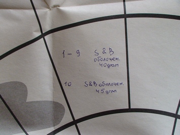 Далее. Мишень была 100-дольная для дроби, но мне главное было получить стабильные попадания в черный кружок по центру, чего раньше не было. Первоначальная ошибка при прошлой пристрелке лежа с упора была в том, что опирал карабин на не на цевьё, а, недомыслие попутало, на ствол в районе мушки (для устойчивости во время прицеливания). Словом, избавился от двух порочных факторов и приступил к вводу поправок в прицел, чтобы выйти на ноль на 100 м. Получилось не слишком адекватно вводимым поправкам. Причин может быть несколько: и не супер стабильные по качеству патроны (S&B), и порывы ветерка, и жесткий спуск, и не слишком прочный стол под станком. Больше досадовал на тяжелый спуск. Что нужно подшлифовать в УСМ, чтобы уменьшить усилие?