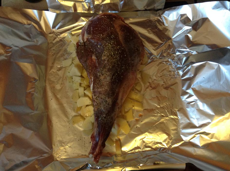 2. Ножка молодого кабанчика. Принцип тот-же маринуем в травах, шпигуем чесночком, на дно кладем немного картошечки, весь сок она впитает и будет очень вкусно. И в духовку.
