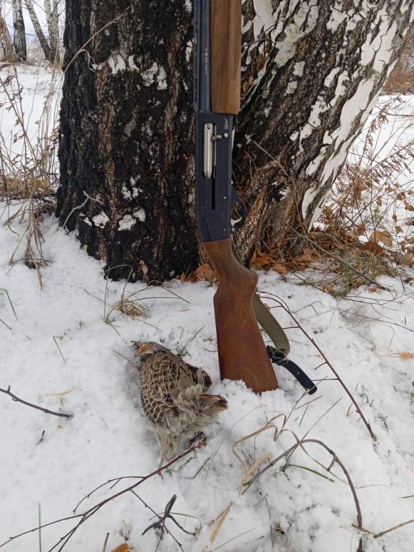 Отмечусь немного. Пока гонял ушастого, в овражке поднялась стайка голов 5. Сбил самую ближнюю. Патрошки уж больно не по курам. 30 м примерно, троечка б/к.