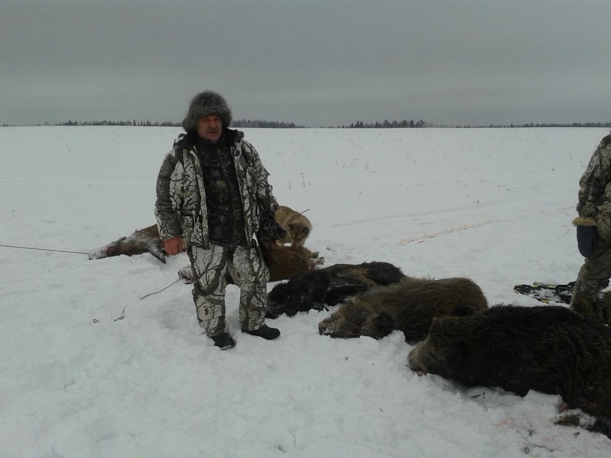 В праздники вырвались на охоту в Кировскую область, как всегда в хорошей компании не надо ничего объяснять и говорить что кому делать все ка-то машинально и непринужденно! Вечером добродушно встретили Кировские егеря и мы улеглись спать ,а утром уже мчались на снегоходах к заветным лесам и пролескам. Поиск зверя был не долгим пока мужики обрезали квартала мы даже чай не успели допить ,как команда по "машинам" через 5 минут уже все на номерах в ожидании загона.Через 30 минут первый выстрел и пошло поехало.... одного подранка не стали добивать привезли всех собачек чтоб малость потренировались на нём, потом пошли в лес собирать трофеи ,затем фотки раздела и на базу,итог первого дня 5 шт. Один секачок был взят с 270 метров