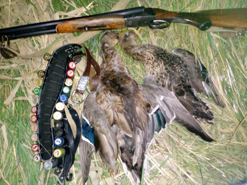 В пятницу была неплохая вечерка. Два крякаша уехали со мной. Первый летел в стороне и плюхнулся где то в крепях за спиной. Но очень охотно отзывался на манок. Я начал подбирать нотки для приглашения его на мой плес,и уговорил. При перелете на мою лужу, был успешно добыт. Второй был бит уже потемному, на границе черного камыша и светлой полоски догорающего дня. Найден уже при помощи фонаря.