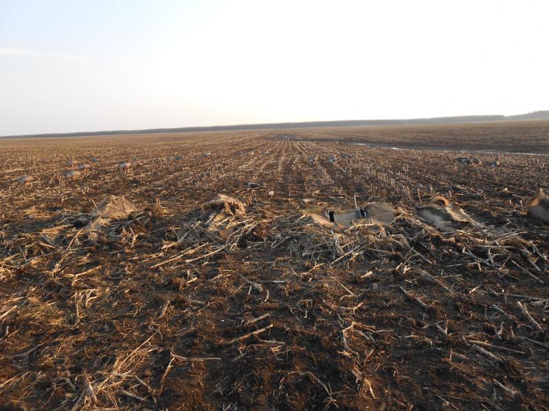 Я ж сказал, что я новичек, вместе со всей своей компанией:-) Приехали накануне открытия в ОДОУ БЧ, половину дня изучали карту полей. Благо нашелся местный житель из охотников, который согласился помотаться с нами по полям (за что ему огромное спасибо!). Первое, куда поехали, это был железный вариант - кукурузное поле за переездом... кто был в прошлом году там на открытии меня поймет... Я конечно полный профан, но даже я увидел, что ловить там нечего: машин 12-14 на поле стоят - ямы копают, вдоль всей посадки шатры разноцветные стоят, как на пл. Куйбышева во время ярмарки.... я ещё от переезда почувствовал шикарный запах шашлыка :-) :-) :-) Ии нехватало только шл@х и феерверка... Наш проводник сказал, что гуся здесь точно не будет, и мы поехали знакомиться с сельхозугодьями дальше. Короче, незадолго до заката, потеряв все надежды, мы стояли и разглядывали в бинокль одно из потенциальных полей с убранным подсолнечником. И увидели, что из-за излома поля мы не сразу разглядели, как со стороны дальней противоположной посадки стая за стаей на поле садятся гуси!!! Как я не пытался рассмотреть их в поле, я не видел, мешали складки поля... короче убедившись, что гусь здесь кормится, мы счастливые и довольные остановили свой выбор здесь! Отвезли проводников в деревню, поужинали и вместе с закатом вооружились лопатами и выдвинулись в поле копать скрадки. Идем в поле, машина осталась естественно на краю, болтаем, мечтаем о завтрашнем успехе... и когда ноги начали вязнуть в чаче... прямо рядышком: Га-Га-Га!!! Пока мы обсуждали услышал я это или почудилось, в 30-ти метрах начали стая за стаей подниматься!!! В каждой, голов по 200-300. Я прикинул, что их всего было тысячи полторы!!! ![]() Они не улетали! Кружили у нас над головами метров 10-15, аж небо потемнело!!! А в руках только лопата :-) ну можно еще былоисапог снять и сапогом швырнуть :-) Но если честно, было еще часов 6 до открытия охоты и мысли брать с собой ружьё на подготовку даже не возникло. Факт в другом: я никогда не думал что мурашки могут быть настолько крупными :-) :-) :-) Как потом стало ясно, в складке поля, которую я такии не смог разглядеть в бинокль, была огромная снежница. На неё гусь вечером и налетал, а т.к. воды было много, он остался там ночевать! Если б мы знали!?... В итоге, гусь ушел. Мы огляделись по воде, копать окопы невозможно... к утру это будут колодцы, а не скрадки... а прыгать утром в ледяную воду ну очень не хочется! «Утро вечера мудренее!» - так и решили :-) Ночь мы провели в стиле мозгового штурма! В итоге, лучшее, что придумали, это подручный материал: черный полиэтилен, который брали для того чтоб обложить края ям, был порезан на три ровных квадрата 2х2 метра, в центре вырезана дырочка для головы. Для полноты картины представьте себе: три мальчика-колокольчика :-):-):-) Чтоб не торчать в поле столбами надо было сесть, но не в самую же чачу((( Нашли за сараями старые доски и сколотили из них Т-образные «поджопники». Типа колышком в грязь оперлись, на площадочку и жопу можно прислонить))) Расчет у нас был на то, что на поле снежница, т.е. блестит. Пленка наша черная, тоже блестит, а чтоб более естественно - вымазали там же в поле в грязи, которая подсохла и сделала пленку местами матовой. Вышли в 4 утра в поле, сели вокруг снежницы с трех сторон, я расставил свои чудо-профиля, и понеслось))) Если бы мы умели стрелять... результат был бы шикарнейший! Гус