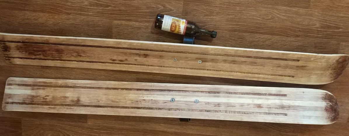 эти, лыжи что на фото, полагаю из склееной фанеры(кусочками), были подобные не долго ходили..., морилка и мазь для лыж или смолить, но очень уж пахнет Морилки хватает до плюсовой температуры на весь сезон, мокрый снег конечно не в радость ей.