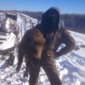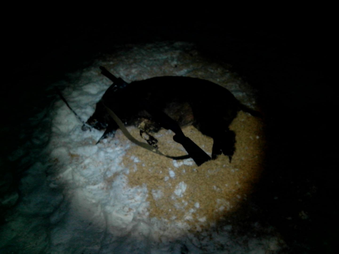 Повезло прям перед новым годом. Притопал к вышке прям перед сумерками, высыпал пожрать, залез. Чайку выпил и думаю ждать еще долго, вздремну. Развалился и дрыхну, сквозь сон слышу, идут. Пока они жрать не начали не двигался, сердце готово выпрыгнуть было. Кружили кружили, но голод не тетка,сначало первый не выдержал, потом остальные, начали чавкать. Вскинулся, включаю фонарь, выстрел, один лег, еще два выстрела по бегущему, но мимо.... |