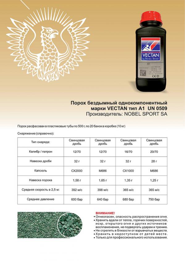 Охотничий одноосновной бездымный порох Drago vectan по заказу компании Cheddite был изготовлен итальянской компанией Nobel Sport и называется Vectan – специально для калибров 12/70, 16 и 20. Он обеспечивает высокие баллистические характеристики и низкое дульное давление. Порох адаптирован к низким температурам, благодаря оптимальной технологии производства. На банке имеется состав и рекомендации по снаряжению. |