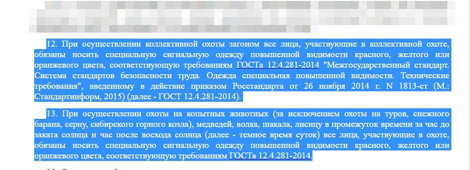 В связи с открытием в Самарской области охоты по кабану хотелось бы освежить в памяти правила безопасности, а именно использование участниками коллективной охоты сигнальной одежды. Это с недавних пор стало обязательным требованием и прописано в Правилах охоты (п.п. 12 и 13). Текст пунктов я привёл в прикреплённой картинке. Правила ссылаются на ГОСТ 12.4.281-2014 года. В нём фигурируют жилеты красного, жёлтого и оранжевого цвета. Но в охотничьих магазинах кроме всего прочего продаются шапки и некие нарукавники указанных выше цветов. Возникает вопрос что необходимо, а чего достаточно для участия в коллективной охоте? Накажут охотника если он будет в красной шапочке или нарукавниках, но без жилета? А если будет в жилете, но зелёного цвета? Ссылка на ГОСТ: