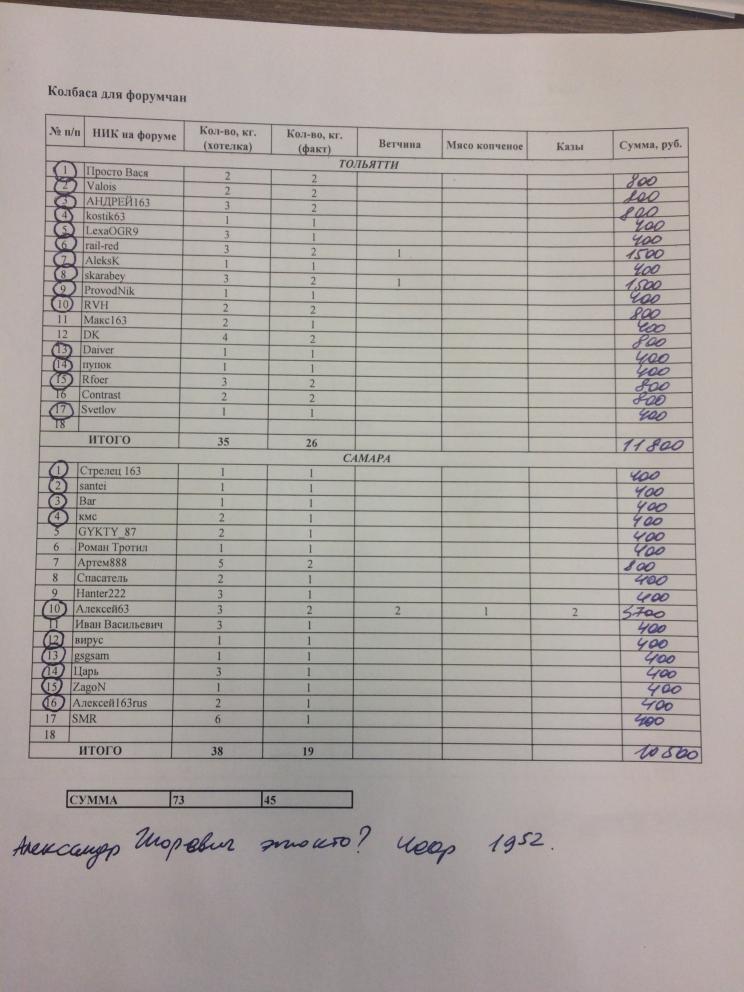 Произошел казус, я забыл включить себя и своих родственников. Доп партия не образовалась. Всего 51 кг. колбасы, из которых 6 моих родственников и мои. Прошу понять и простить... Разделил так: кто первые мне звонили - добавил и те кто немного быстрее были тут... Еще раз говорю, ни каких обид, я вынужден был кого то порезать в Заказе... Окончательный список с суммами, можно переводить на карту № 4276 5400 1887 1784 Алексей Алексеевич М. с Ником участника. К телефону привязана 892777847бо.