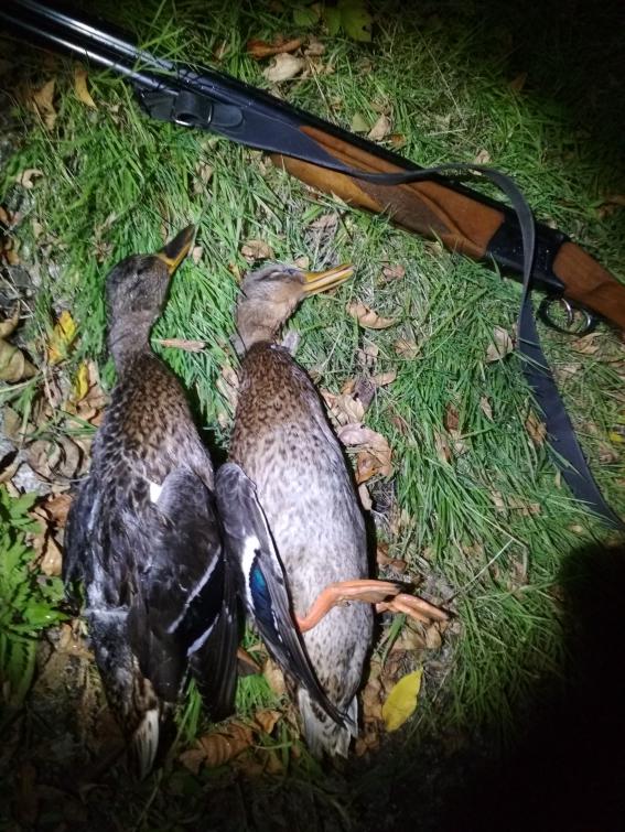 Выскочил на вечерку солнце уже скрылось за горизонтом, ехать 10 минут от дома, встал на заветное болотце. Вальдшнеп пролетел, интересный полет осеннего долгоносика, мало их тут, пусть летит пташка. Покрякиваю в маночек вижу за деревьями три знакомык силуэта, даю осадку-сработало кряки складывают крылья на посадку, бью первым утка падает на сырой берег смачным шлепком и окатывает меня тиной, перевожу стволы на вторую, не медлю, жму спусковой крючок, есть!, падает на воду, 15 минут танцев с бубном и длинющей палкой и алга домой.