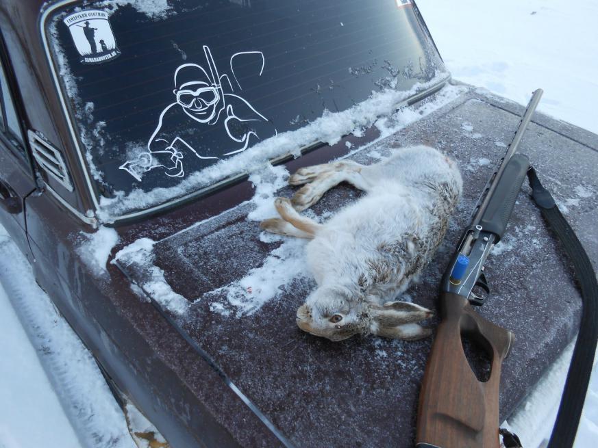 Вчера не успел вытропить ветер поднялся, а сегодня на том же месте втот же час! 10мин, поднял сразу, через кусты стрелял и+ далеко...,ставлю собачку, сам на место предполагаемого выхода с круга, только добегаю, смотрю зая чешит. Оформил все как положено! Минут через 40 отец звонит, поднял еще одного, я туда... Гоняли 2 часа, потом забрали домой. В итоге 3х подняли, 2х увезли)