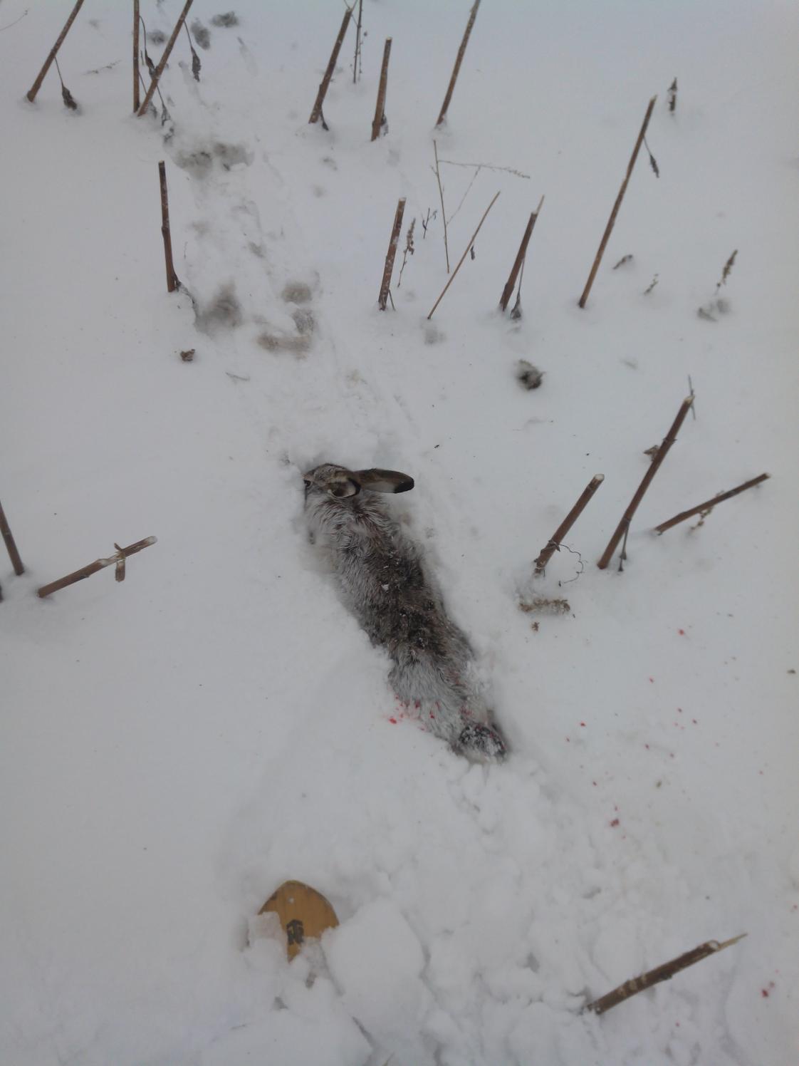 Сегодня повторил свой выезд. С утра туманище видимость 50 м. Прошёл метров 500 следов много, но вчерашние. Иду вдоль посадки, туман рассеялся, и вижу впереди кочку и как-то на автомате на неё стал направлять, метров за 150 кочка превращается в зайца и уходит вдаль, как раз туда где в прошлый раз поднимал. Решаю его оставить, пройтись до другой жировки и зайти к нему с другой стороны. Подходя поднимаю ещё одного метров за 200, ну думаю не мой день, наст хрустит близко не подпустит. Возвращаюсь за первым, и точно в том месте где думал поднимается. Первым мажу, после второго закувыркался, пока перезарежал он вскочил и на 3 лапах деру, салютую в догонку, но он уходит через поле и посадку в скошенный подсолнечник. Попил чайку и за ним. Кровит много, должен лечь. Подсолнух уже в других угодьях, но оставлять нельзя. Метров 700 кружу за ним и вдруг след кончается, смотрю хвост торчит из снега, думаю дошёл, только руку сунул, опять вскочил и бежать, ну тут я уже не промазал.
