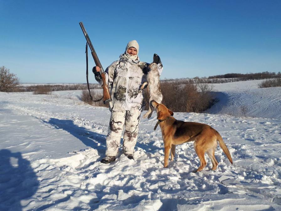 Начну с того, что нормы у них 2 зайца в день и 10 на сезон. Охотились в ОДОУ, разрешение дается на всю область без разделения по районам. Охотились вчетвером и выжлец РПГ. В субботу утром -25, слабый ветерок. Снега в полях в разы меньше чем у нас, практически везде куда хотели, проезжали. Лыжи нужны были только в посадках. Решили толкать посадки. В первом же загоне взял лису. Еще одна ушла в поле. Во втором уже я в загоне. Подняли 2 лис, одну взяли, 2 коз (видел метров за 300) и просто огромную стаю куропаток, голов 40-50. В третьем стрельнул еще одну лису. При этом зайцем в посадке было все истоптано, но пока ни одного не видели. Обложили старый пруд. Там наконец был взят первый заяц! Затем опять по посадкам подняли еще 4 лисы, одну взяли. И вернулись к месту где начинали. Пока мужики собирались к машине, я решил пройти по участку неубранного подсолнуха, где еще утром заметил жировку. Отошел 50 м от машины сдвойка, скидка, ружье на готове, подъем метрах в 10, выстрел, готов! Лежал в 20 метрах от жировки в тракторной колее. Лисы очень много. Заяц похоже весь в полях, в посадках она ему не дает лежать. На второй день пробовал тропить, находился по убранному подсолнечнику, обошел 4 жировки, но никого не поднял. Все следы уходили в пашню и там через 100 метров терялись.