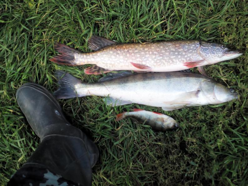 Первоначально судачьи точки в коряжнике молчали. После пары зацепов решили сменить место и посмотреть как там поживают щуки, а к судакам вернуться на закате. Это решение принесло свои плоды. Щуки уверенно тыкались и дёргали почти на каждой проводке! Но либо не цеплялись, либо цеплялись и через некоторое время сходили. В результате смогли вытащить по одной щуке. Я весом 1,1 кг, товарищ - 1,8 кг.На закате вернулись к судакам. Но они на рыбалку так и не пришли. Течения не было от слова совсем. Отсутствие клыкастых списали на это. А в целом неплохо прогулялись. Фото прилагаю.