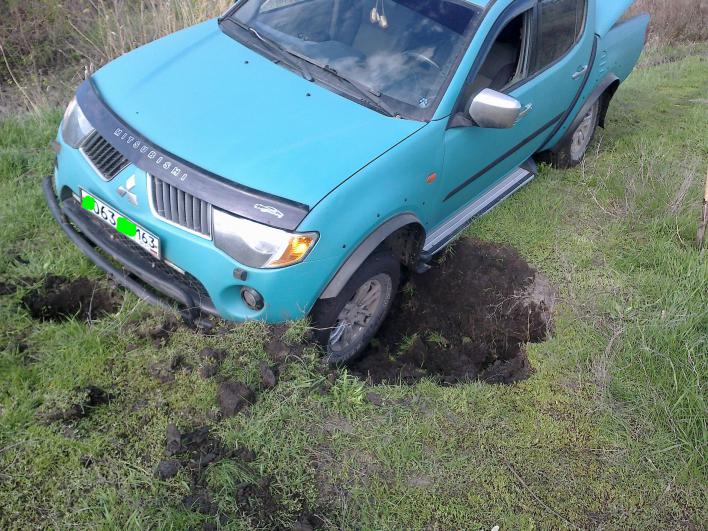 Покатался я сегодня в поисках приключений. Нашел конечно))) причем там где и не ждал. Переезжал овражек по дну которого течет ручей. Ну я ж там бывал и помню что там проложена для ручья толстенная труба. Ну и еду потихоньку и вдруг- бамс. Провалился левым передним колесом по самое небалУйся. Оказалось ручей весной подмыл почву и держался только верхний слой с травкой, а под травкой пустота метровая. Вот туда-то я с размаху и шваркнулся, повезло что ширина промоины была небольшая, а то мог бы и "кильнуться" (термин водномоторников означающий- переворот). Более того при падении весь вес падающего передка машины, а также всю инерцию от движения вперед приняла на себя передняя силовая губа, на ней элька и повисла.