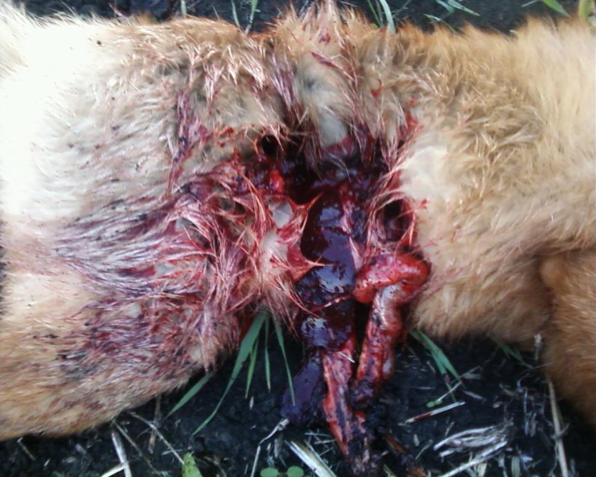 Попадание в левую лопатку. Пуля пробила животное насквозь разделившись на 3 части, на фото видны выходные отверстия. |