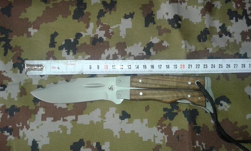 "Оборотень"- оригинальный балисонг-инструмент. Является ножом выживания в экстремальных ситуациях. Аналог боевого ножа . Имеет клинок и мастер - клинок. В первом положении ручки закрывают мастер - клинок на фиксатор. Клинок типа Drop point имеет бритвенную заточку. На обухе ножа есть фальшлезвие с зубьями, которые используются в качестве рыбочистки и стропореза. Во втором положении ручки рукояти перекидываются на 180- закрывается основной клинок. Мастер- клинок выполняет функции пилы по дереву, пилы по металлу, консервооткрывателя, гвоздодера, отвертки, ключа для открывания бутылок. На нижней половине рукояти дополнительно размещены плоская отвертка и шило. Обе части рукояти имеют деревянные накладки. В рукояти имеется отверстие для темляка. Не является холодным оружием.
