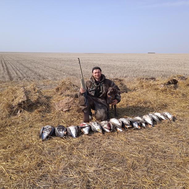 Были на севере Саратовской области. В пятницу заехали, видели только чистое небо, соответственно места присады, кормёжки и т.п. глупостями не стали заморачиваться - доехали куда смогли, напоролись, еле встали с утра, как рассвело, похмелились, взяли картечь, не смогли найти лесопосадку, встали в снег на краю стерни: