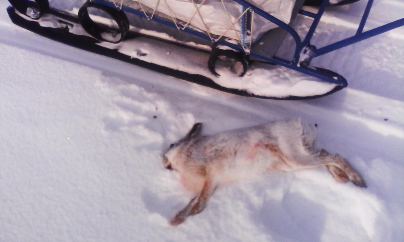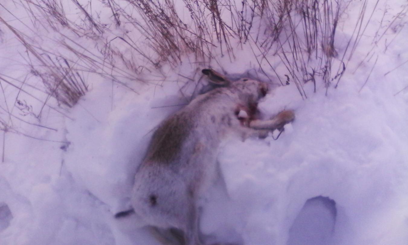 Проехал 3 км следов море где же мой пробежал!? Еду вдоль полосы сдвойка, кончались следы зайца кругом одни лисьи....Иду на боевой разворот вот скидка... Встал на лыжи иду вдоль полосы ...Встал заяц метров в 25-ти чешет в дебри лесополосы ясеня- вскинул машинально... выстрел, брызги снега -агония, дошел мой первый новогодний заяц вот он....