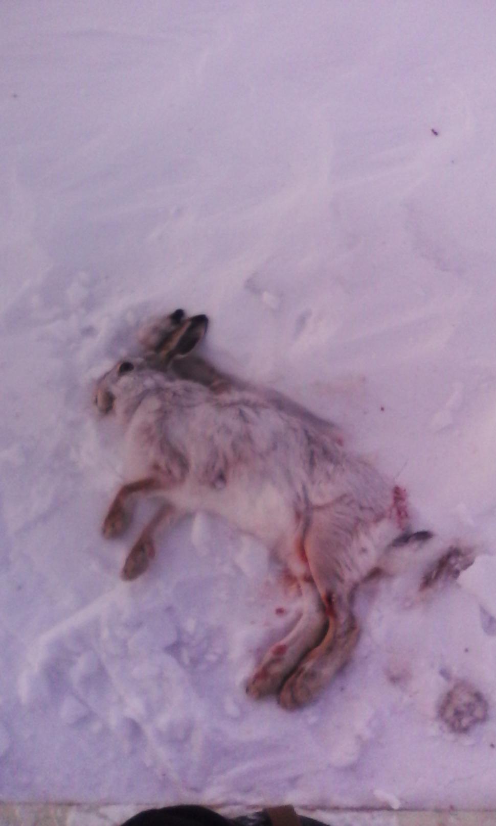 Решаю сократить путь и обрезать след идущий в заросшей чипыгой дол... ветер на меня с право начал обрезать- иду. Солнце как блин прорезалось сквозь дымку. Краем глаза замечаю на снежном наносе(как бетон) на пашне покоп в трех шагах с лево от меня и заячий след ведущий туда -ВООт он где голубчик!!! Решаю достать камеру лезу в карман зайца не видно тщетно далеко убрал чтоб не замерзла...Косой медлено высовывает голову показался серый лоб, хитрый и любопытный глаз начал изучать мою личность-эх камеру уже не достать... Даю команду ему ДАЙ! нехотя выскакивает с теплой протаяной лежки, набирает обороты 2 выстрела по косой в угон- отстегнул задние ноги идет на передке, кружит ворона над подранком, бегу добрать!!! пытался включать камеру на морозе не хочет работать наснимал кусков сляпал кое как видео добора ну и видео разбора ситуации....
