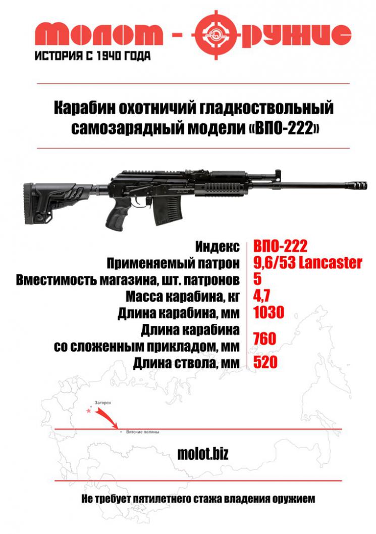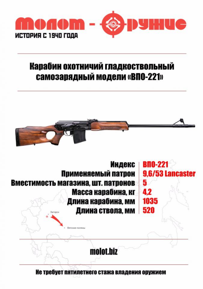 Уважаемые друзья, в магазине "Оружейный двор" представлен ассортимент гладкоствольных карабинов в калибре 9,6x53 Lancaster - производства завода "Молот-Оружие" (ВПО-220 L550мм - на базе знаменитой «трёхлинейной» винтовки системы Мосина образца 1891/1930 гг, ВПО-221 L520 и 590мм, ВПО-222 L420, 520 и 590мм) и "Концерна Калашникова" (TG-3 пластик L620 - гладкоствольный СВД)