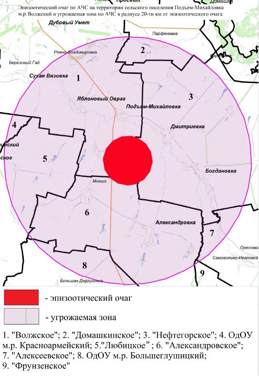Ограничения охоты коснулись территорий следующих охотничьих угодий: Красноармейское, Константиновское, Любицкое, Майское, Пестравское, Степное, общедоступные охотничьи угодья муниципальных районов Красноармейский и Большеглушицкий. Обращаем внимание охотников, что ограничения распространяются на территорию, входящую в 20-ти километровую угрожаемую зону вокруг эпизоотического очага по африканской чуме свиней. |