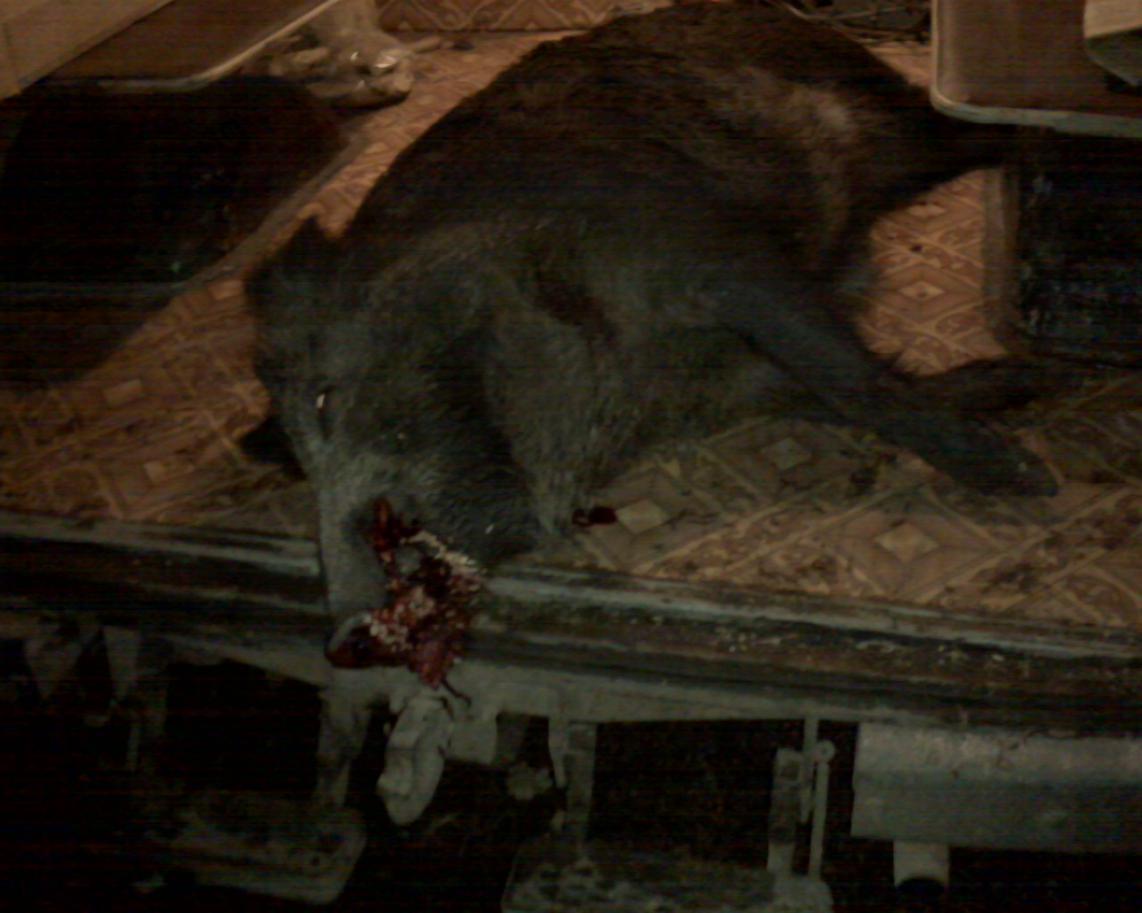 Один выстрел, 338 Винмаг, деп 0, дистанция 50-60 м, строго в шею, пуля 15,8 гр Федерал Аккубонд, легла сразу, 120-130 кг.
