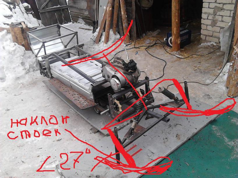 передняя подвеска уже готова, все прикручено и приварено.угол есть. осталось лыжи.