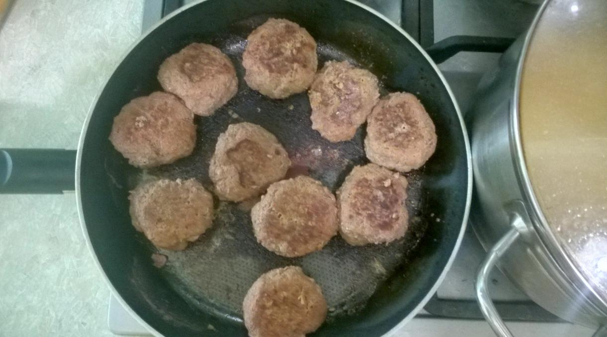 Смешиваем всё вместе, добавляем пару яиц, соль, карри, суп томатный и стакан молока. Всё перемешали и на сковородку где растоплено кабанье сало.