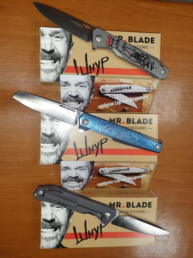 Ножи Mr. Blade от Сергея Шнурова - лимитированная серия с великолепно выполненными на клинке изображением и автографом лидера питерской группы «Ленинград» - Сергея Шнурова. Серия включает в себя три топовых ножа «в титане»: KEEPER («Хранитель»), LANCE («Копьё») и SNOB («Сноб»). Все ножи серии изготовлены ограниченным тиражом и имеют порядковые номера.