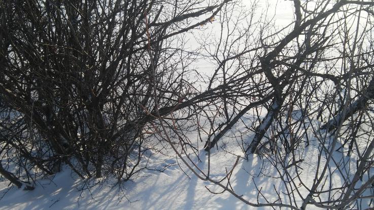 Косой лежал под кустом (фото2), кобель прошел в 2 метрах от него. Брат метрах в 15-ти. НЕ ПОДНЯЛСЯ. На встречу ехали 2 снегохода, как сказали работают по лисе. Только от их шума у зайца сдали нервы. Собаки уже работали в долу, пока пришли к лёжке, след замело. Выжлец метров 300-400 по нему прошел и вернулся обратно. 1-0 в пользу ушастого. Погуляли от души.
