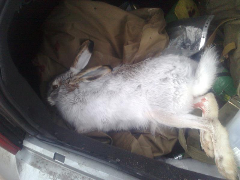 Сегодня взял реванш за вчерашний день. Встал с утречка, сына в садик отправил, а сам за машиной и за собакой. Проехал (там где смог конечно) следов нет. Ветер приличный. Хотел было уже домой поворачивать, но вроде как что-то знакомое на обочине. Остановился, точно следок, выход с поля на дорогу, а на дороге теряется (с утра машины успели проехать). Ввиду того, что других следов мне больше не встретилось решил поискать. Прошел по дороге в одну сторону - ничего. Иду в другую, вот и скидка. Иду дальше по следу чтобы хоть как-то направление определить (думаю если к дороге повернет собакой рисковать не буду, брошу). След без сдваивания уходит по прямой вдоль дороги. Прошел я метров 70-80, след так и идет по прямой, но слева и в трех метрах от него уже обратный. Что-то не то, хитрит косой, поворачиваю налево, метров 5 и небольшой куст ковыля просто взрывается и вылетает зайка. Между нами не более 10 метров. Отпускаю немного и бью. Зайка делает кувырок и затихает. На часах 11:40, ну и ладно, пора домой к сыну в садик, на новогодний праздник.