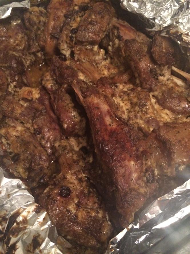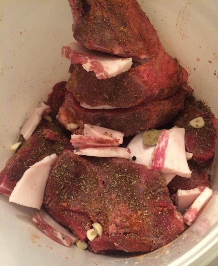 Один к одному горчица (я беру ленте 22 руб баночка) и майонез плюс сухие специи. Натираем и на сутки в холодильник. В разогретую духовку на 170-180 гр на 1,5 часа в рукаве (или фольге).