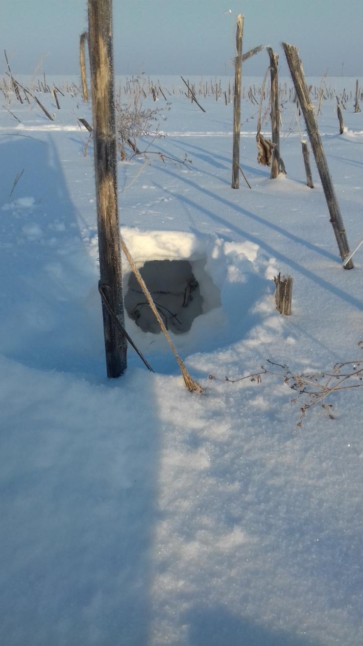 В общем прибыл я в угодья в 8:30. Брат только через час приедет с работы. Ну, а чтобы просто так не тратить время, решил пройтись одну посадочку. Захожу за посадку, и сразу свежий след по лыжне вдоль нее. В субботу тут уже погоняли косых. Ну ладно, иду по следу в надежде, что зая заляжет недалеко. Не тут-то было. Косой прошел всю посадку (2км), вышел на подсолнух и только метров через 500 я увидел первую сдвойку и скидку. Сразу осмотрел поле, ищя накопки. Метрах в 100 замечаю что-то похожее. Держу курс на нее. Подхожу, адреналин бурлит в крови, представляю, как... сейчас... он... выскочит... и... Мля, когда?!! Пусто! Кролик не дождался(. Только уходящий след в поле.