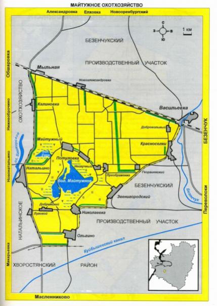 Северо-восточная граница: от железнодорожной станции "Мыльная" на юго-восток по железной дороге "Октябрьск - Безенчук" до железнодорожной станции "Майтуга". Юго-восточная граница: от железнодорожной станции "Майтуга" на юго-восток по проселочной дороге через населенные пункты: Красноселки, Звенигородский, Николаевка, Ольгино по административной границе с Хворостянским районом, далее на запад по этой границе до автодороги "Совхоз им. Масленникова - Мыльная", исключая озеро Майтужное со 100-метровой береговой линией по периметру озера. Западная граница: по административной границе с Хворостянским районом на север по автодороге "Совхоз им. Масленникова - Мыльная" через населенные пункты: Луговой, Натальино, Калиновка до железнодорожной станции "Мыльная". Майтужное Рельеф местности равнинный. Вся территория относится к бассейну реки Безенчук. Основу хозяйства составляют полевые угодья. В центральной части расположено болото Майтужное с окружающими его сенокосами и пастбищами. Лесных угодий практически нет. Водные запасы сосредоточены в нескольких небольших прудах. Основу охотничьей фауны составляют кабан, косуля, заяц-русак и серая куропатка. Встречаются также лисица, хорь, горностай, норка, ондатра. В прудах водятся лишь плотва и карась. Охотпользователь: Муниципальное унитарное охотничье рыболовное предприятие "Волжское". Схема охотхозяйства