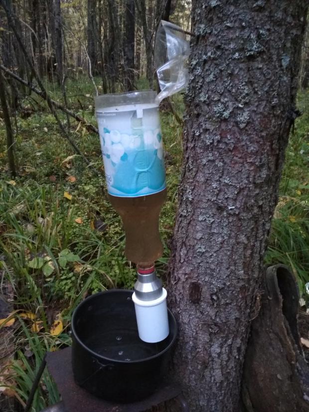 Протопав пару км по лосиным тропкам, к своему удивлению, наткнулись на вполне свежую канистру. Ее помятость нас не смутила. В лесу ничего не нужно бросать, все пойдет в дело: канистра, проволока, гвоздь… Внутренность оказалась вполне чистая, из-под воды. Берём, очень кстати.