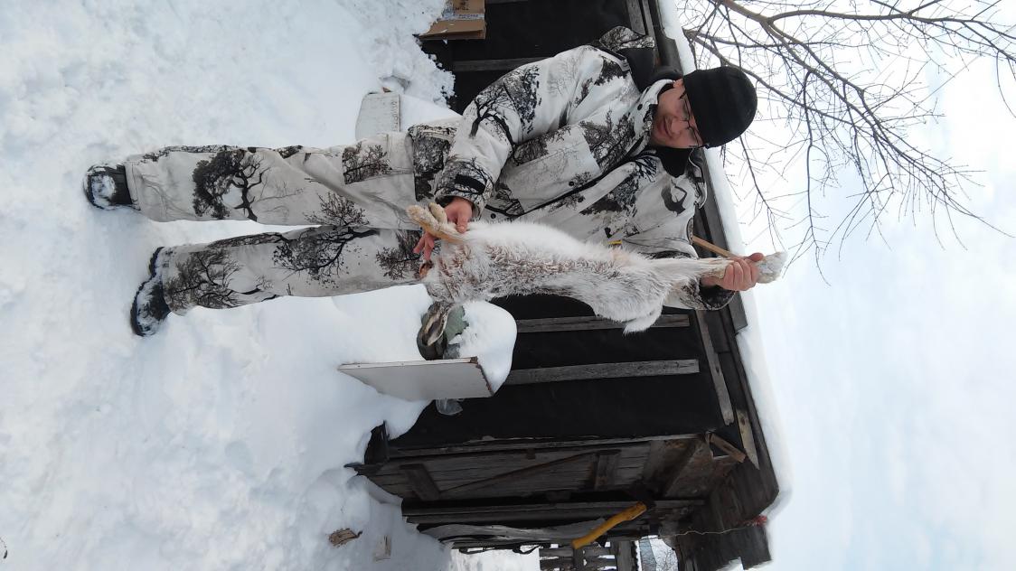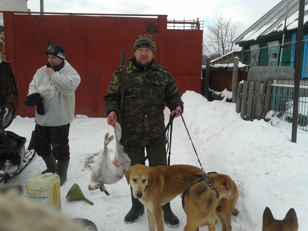 Решил испытать удачу сегодня. Собаку не стал брать. Прошел по старой лесополосе. Следочки есть,но мало, а в поле уже не видно, заметает. В посадке оказалось пусто. Пошел через поле в долик. Один был, поднялся метров за 30. Выстрел, зая споткнулся, вторым мимо. Показался, что подранил. Посмотрел след, кровит. Перебита передняя лапа. Заяц прямиком к лесополосе. Я за ним по следу. Метров за 70 выскочил из леса и сел на сугробе. Стрельнул на удачу. Зая дальше, пробежал метров 200 и скинулся в лес. Решил больше не гонять. Съездил за собакой. Поставил на след, а сам обратно отошел в прогал, подумал, что может вернуться. Не прогадал,через минуту вышел в 40 метрах и был взят.