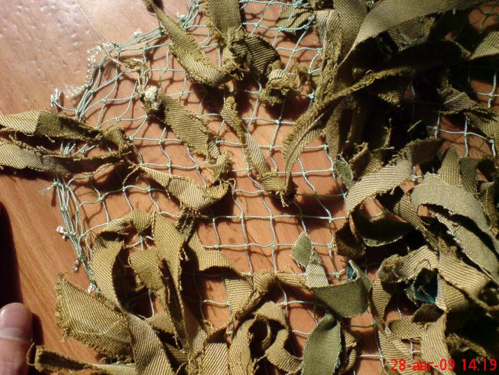 1.сетка ячея 1.5\1.5см полотно 2м на 4м 2 старые афганки\комки(с армии остались) 3 желанье афганку нарезал соломкой примерно ширина 3-5см и длина произвольно. в произвольном порядке на два узла привязывал. мне нравится. тока тяжеловатая. натуральный материал |