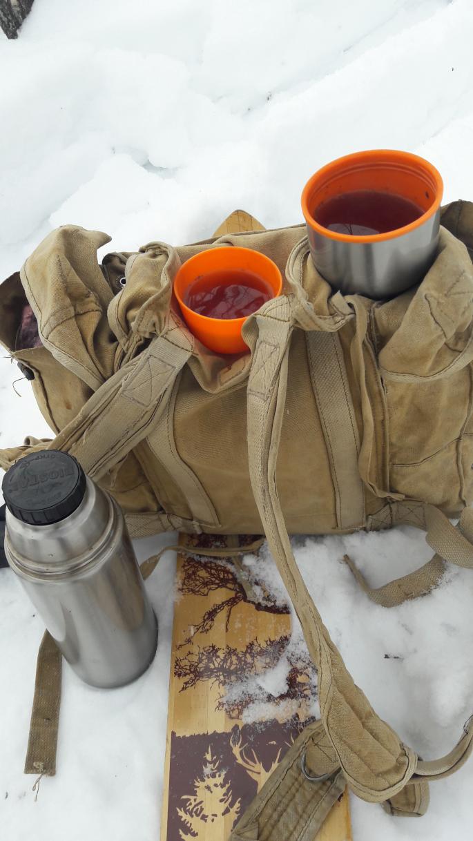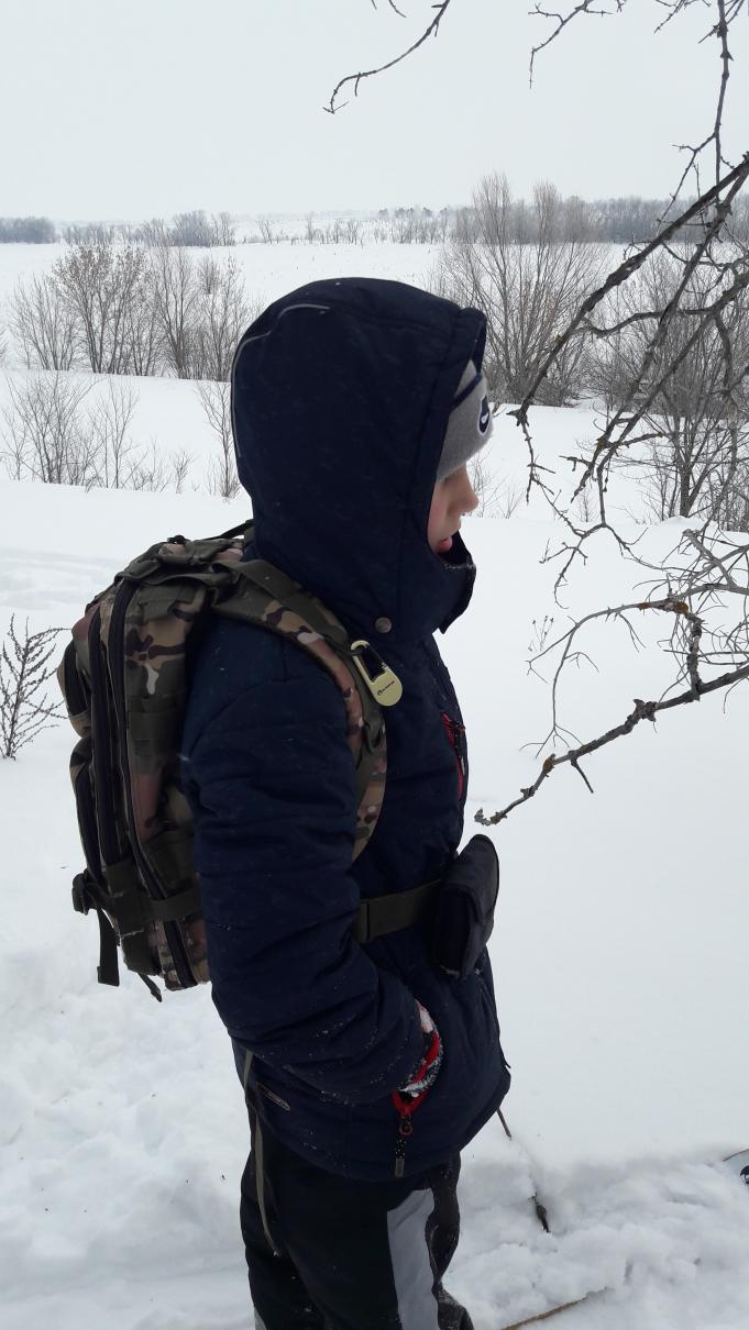 ). Чую, только ради нового рюка и поперся со мной, потестить. Проверив все и добавив запасные варежки и носки, обозначил подъем в 5:30 и объявил отбой. "Зам.потыл" в это время шинковал бутеры на кухне и наполнял термоса сухим составом. Сын в 5:30 с полпинка (в школу бы так вставал!!!!) побЁг умываться, а я за машиной.В начале девятого были на месте, где 10 дней назад малика и старых лежек было, как конфетти на городской елке. Но.... поймать такой болт в в таком моменте я не ожидал! Просто было пусто... Одна лиса... Гуляли по орагам, вдоль посадок, по кошенной и некошенной семечке - БОЛТ!!! Ничто так не остужает охотничий азарт, как отсутствие зверя или, хотя бы, следа. Сын немного скис, и через пару часов взяли обратный курс. Эх, хоть бы один следочек для затравки! Но... ДЕНЬ ЗРЯ НЕ ПРОШЕЛ!!! Подняли выводок кур, нагулялись, сын пару раз скатился с горки на широких лыжах. И главное, сын сам 4 часа таскал свой рюк со своим шмурдяком. Много не прошли, всего 5-7 км и на этом решили остановиться.