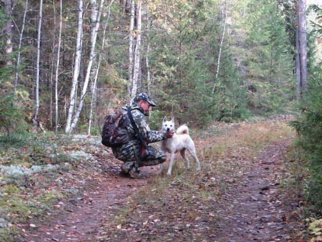 В этот раз помощница была. Молодая правда, 9 мес. Белку работает хорошо (только нафига сейчас белка, невыкунила она ещё), по боровой – не держит, отметит парой полаек и дальше уходит. А вот медведя реально боится, мишак шел в 25 метрах – забилась под ноги