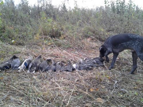 В эти выходные удалось с друзьями выбраться на охоту. Погода не очень, зато результат 16 голов на четырех охотников. И мой пес, ему пол года, а папе помогает.