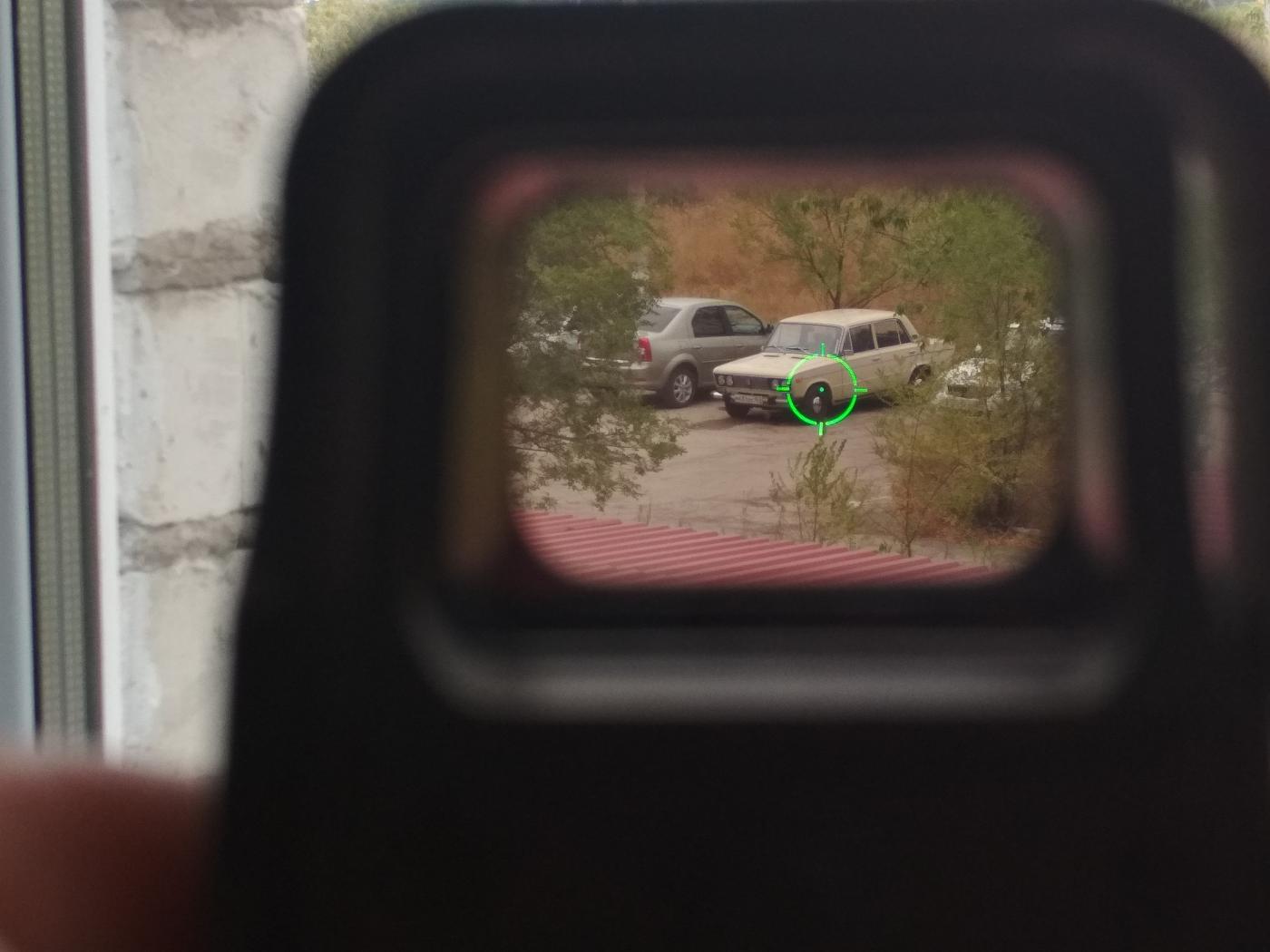 Коллиматор! Не голографический. Марка точка в круге с рисками, универсальное питание 4шт лр44(в любом магазине есть) . Регулировка яркостимарки и 2 цвета(красный зеленый