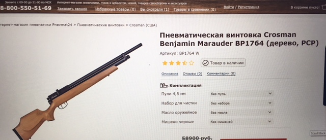 Продаю пневматическую винтовку Crosman Benjamin Marauder BP 1764 (РСР), с предварительной накачкой. В отличном состоянии (около 100 выстрелов), с оптическим прицелом. превосходная винтовка для стрельбы по мишеням и при охоте. 30000 рублей 89023735004 Юрий.