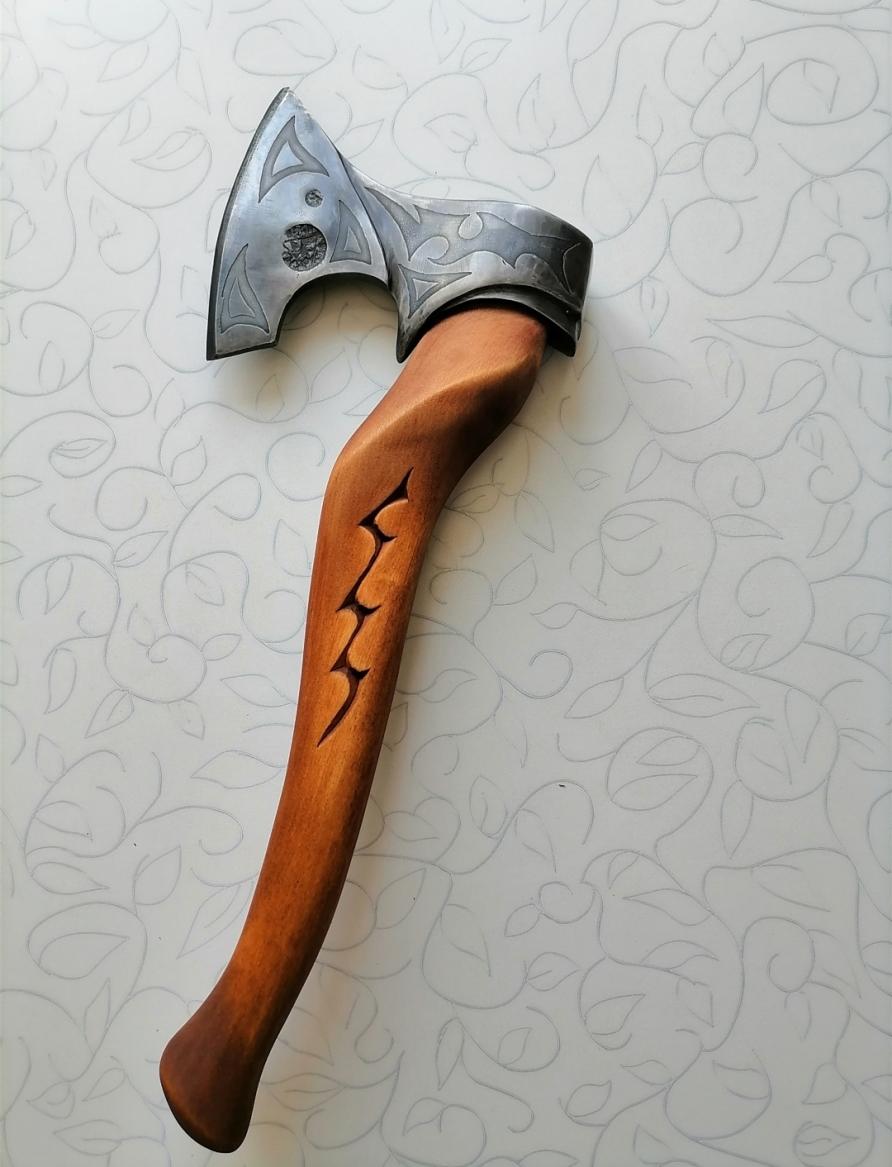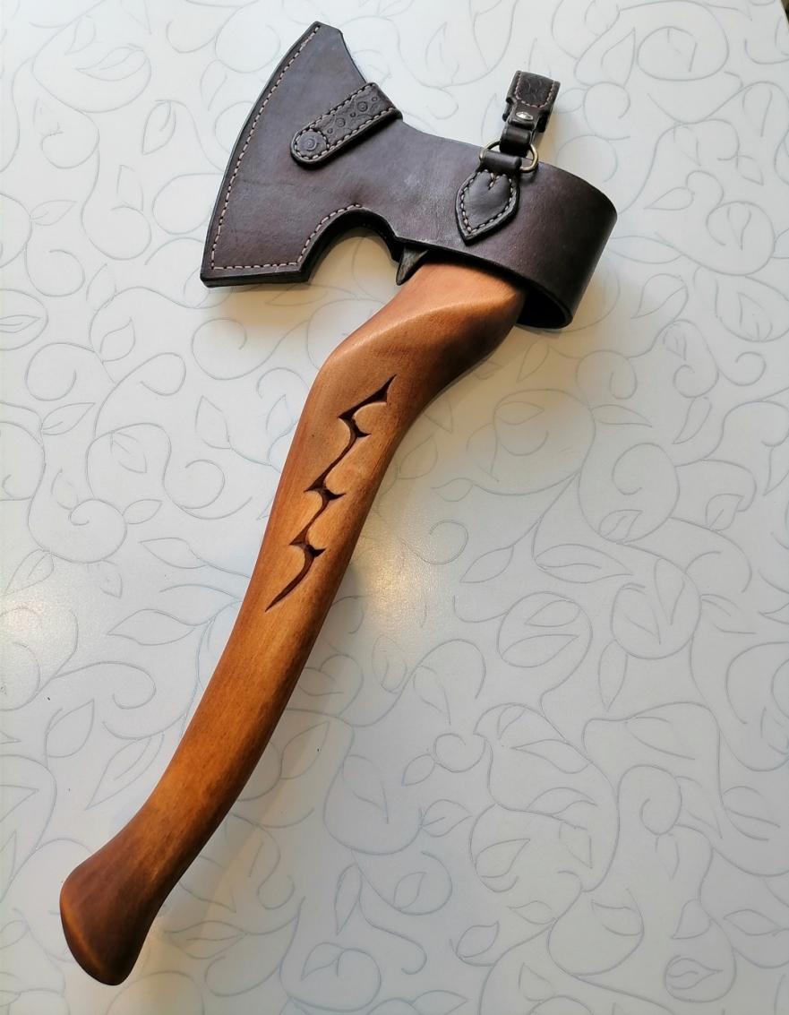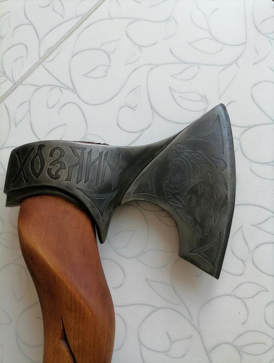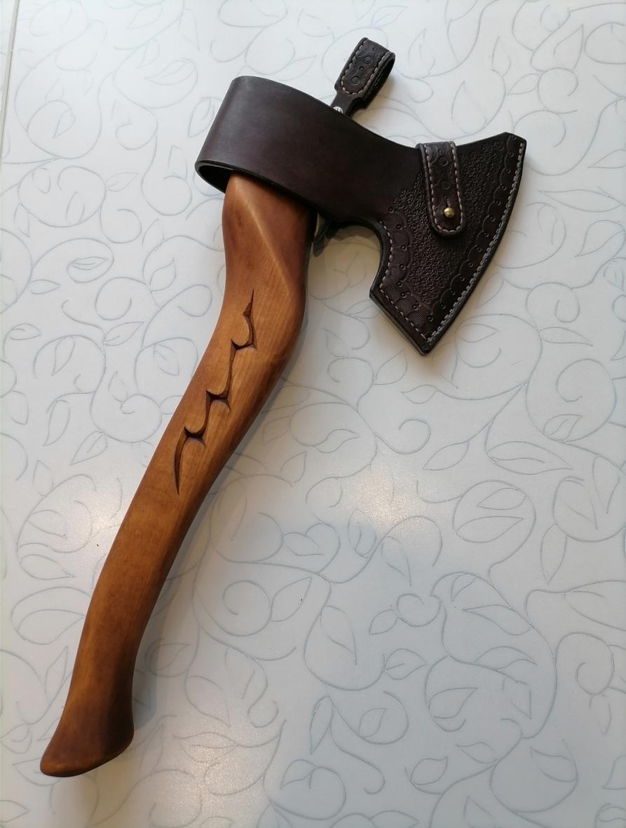 Топор ручной работы "Хозяин". Красивый и надёжный! Голова 1954г. Воронение. Топорище резное из комеля сибирской берёзы. Чехол со свободным подвесом из итальянской кожи с тиснением. Цена 13000р.