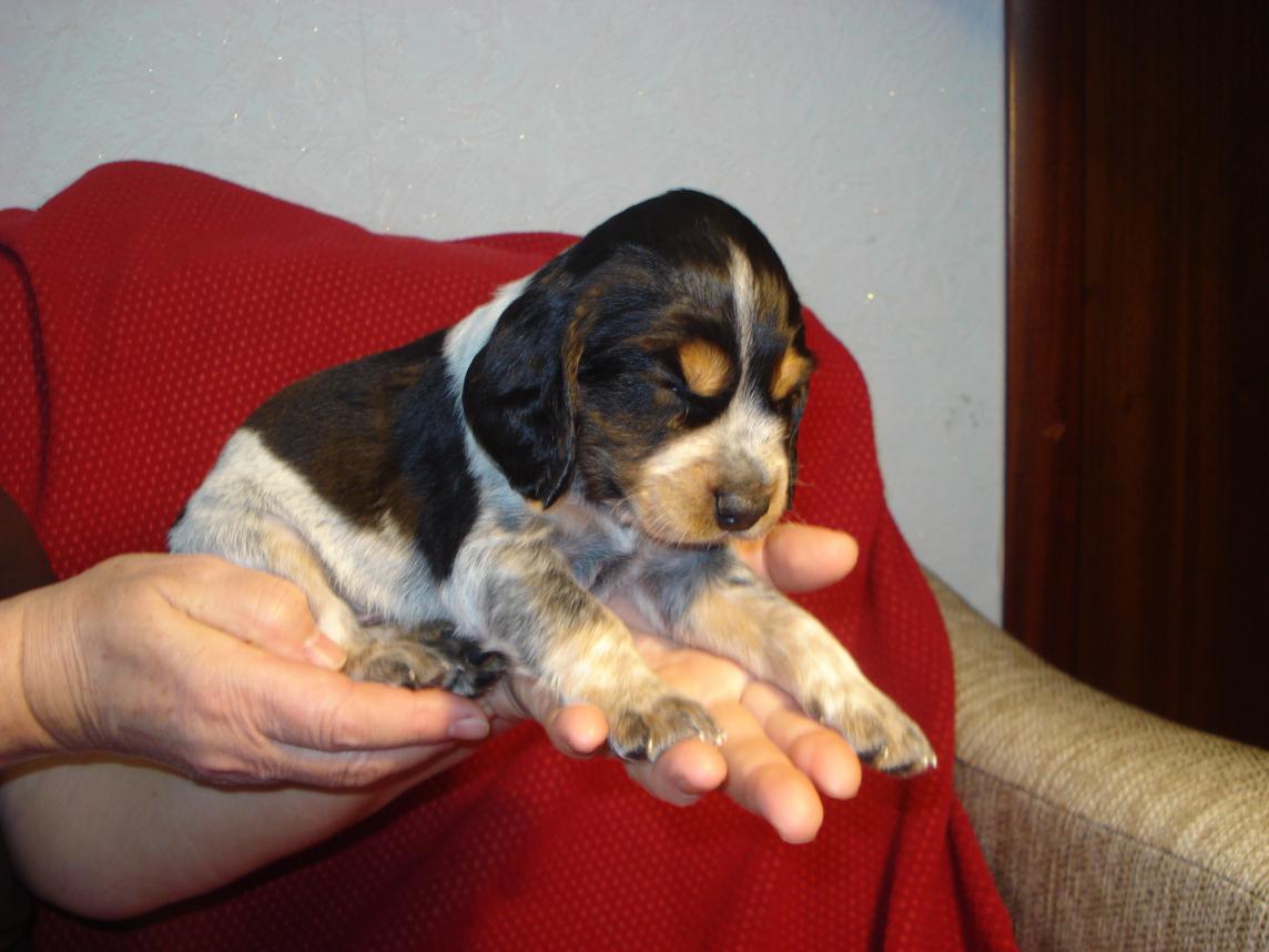 4. Кобель Черно -пегий в крапе с подпалом. Выбран.